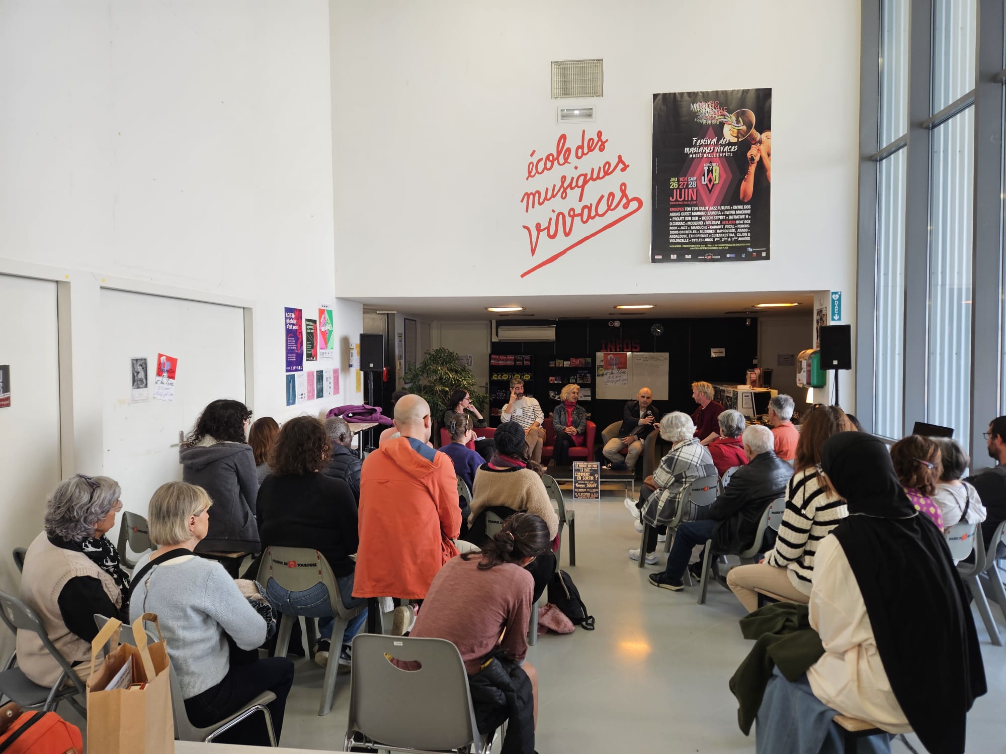 Deuxième partie de la causerie, avec la participation de : Camille Escoubet (fabricant, imprimeur – imprimerie Trace dans le Lot, éditeur et illustrateur – Superloto éditions), Maïté Bernard (romancière jeunesse et adulte, documentaliste – collège Paleficat à Toulouse), Guillaume de Gracia (éditeur – éditions Sans nom, auteur et sociologue), Aude Fares de la librairie Le chameau sauvage et Hovig Ananian de Média ludo à Odyssud Blagnac.